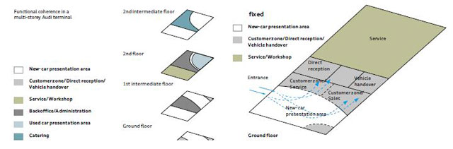 Audi Center Bangkok ถูกกำหนดให้อยู่ภายใต้คอนเซปต์เดียวกันทุกแห่ง ซึ่งต้องมีองค์ประกอบ 6 ประการ ดังนี้