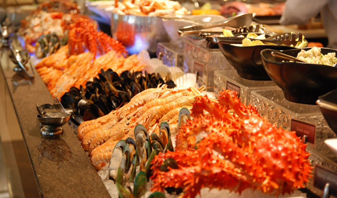 ความพิเศษของที่นี่คือแต่ละวันจะมีธีมบุฟเฟ่ต์ต่างกันไป เช่น วันจันทร์เป็นอาหารอิตาลี, วันอังคารเป็นอาหารเยอรมัน, วันพุธเป็นอาหารลาติน, วันพฤหัสบดีเป็นอาหารเอเชีย, วันศุกร์และเสาร์เป็นอาหารซีฟู้ด เราสามารถเลือกวันมาทานตามความต้องการของเราได้เลย ส่วนไฮไลท์จะเป็นซีฟู้ดบุฟเฟ่ต์ค่ะ บรรยากาศโรงแรมที่ตกแต่งอย่างสวยงามและเพลง Jazz ที่บรรเลงคลอก็ช่วยเพิ่มอรรถรสของการรับประทานได้อย่างดี