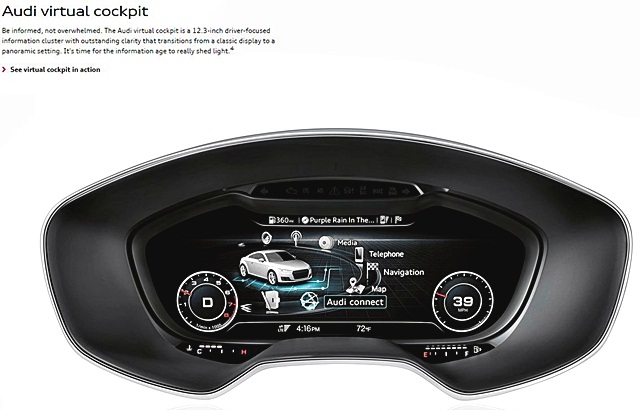 "TTS" เพิ่มความพิเศษจากรุ่น "TT" มาตรวัดหน้าจอแบบ The Audi virtual cockpit information ขนาด 12.3 นิ้ว เปลี่ยนหน้าจอได้หลายรูปแบบตามความต้องการของผู้ขับขี่ เพื่อแสดงมาตรวัด และข้อมูลสำคัญของรถในรูปแบบดิจิตอลด้วยความคมชัดแบบ 3D แสดงการทำงานต่างๆ ทั้งมาตรวัดความเร็วและรอบเครื่องยนต์, ระบบนำทางเนวิเกเตอร์, ข้อมูลการใช้งานของรถยนต์ เป็นต้น สามารถควบคุมด้วยปุ่ม MMI touch บริเวณคอนโซลกลาง พวงมาลัย หุ้มหนังแบบสปอร์ต 3 ก้าน TT sport contour พร้อม ระบบ Multifunction plus ระบบช่วยผ่อนแรงพวงมาลัย (Electromechanical power steering) พร้อมระบบ Progressive steering ช่วยเพิ่มการตอบสนองตามสภาพการขับขี่ สามารรถปรับระดับผ่าน Audi Drive select ได้ 3 ระบบ auto/comfort/dynamic