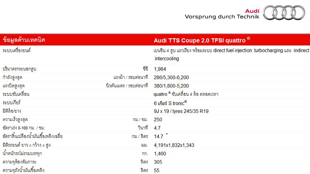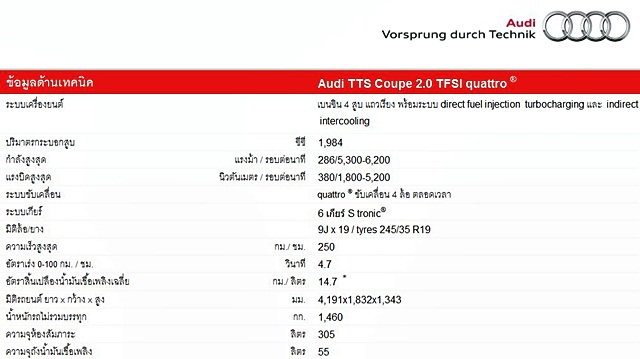 ออดี้ ทีทีเอส - Audi TTS รถสปอร์ตคูเป้ สายพันธ์ุดุ S-Model ของยนตรกรรมออดี้ ถ่ายทอดความดิบจากเครื่องยนต์ทรงพลัง 286 แรงม้า เกียร์ S-tronic 6 จังหวะ พร้อมระบบขับเคลื่อน 4 ล้อ