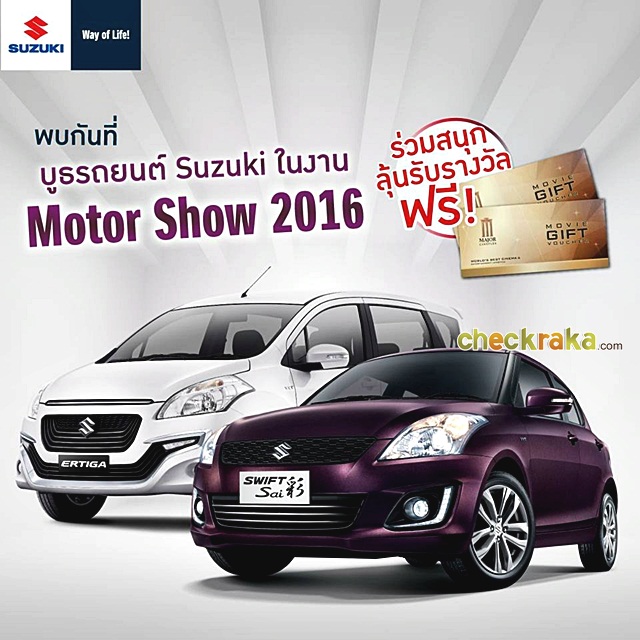 กด like เป็นแฟนเพจ Suzuki Motor Thailand โพสต์ภาพที่ถ่ายร่วมกับ Suzuki SWIFT Sai หรือ New Suzuki ERTIGA ในงาน Motor Show มาที่หน้าแฟนเพจ Suzuki Motor Thailand พร้อมใส่ #SuzukiMotorShow2016 และแชร์ไปบนหน้าเฟสบุคของตัวเอง (ตั้งค่า Public) ชวนเพื่อนมากดไลค์รูปของคุณ ครบตามกติกาและยอดไลค์สูงสุด 4 อันดับแรกของวัน รับ...บัตรชมภาพยนตร์ จำนวน 2 ที่นั่ง ไปเลย แจกทุกวัน ตั้งแต่ 23 มี.ค. - 3 เม.ย. 59 สามารถเยี่ยมชมบูธซูซูกิได้ในงานมอเตอร์โชว์ 2016 และโชว์รูมซูซูกิทั่วประเทศ