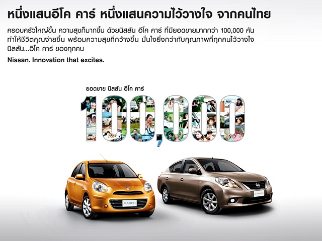 นิสสันก้าวสู่การเป็นผู้นำตลาดรถอีโคคาร์ในเมืองไทย โดยในเดือนสิงหาคม 2555 บริษัท นิสสัน มอเตอร์ (ประเทศไทย) จำกัด ก็ได้ประกาศความสำเร็จของยอดขายรถยนต์ อีโค คาร์อย่าง นิสสัน มาร์ช และนิสสัน อัลเมร่า ทะลุ 100,000 คัน และได้เปิดตัวภาพยนตร์โฆษณาชุดใหม่ "หนึ่งแสนคัน หนึ่งแสนความมั่นใจ" โดยได้ดึง 2 ซูเปอร์สตาร์สุดฮอตในช่วงนั้น คือ เคน ธีรเดช และ โดม ปกรณ์ ลัม มาเป็นพรีเซ็นเตอร์คู่กันในโฆษณาชุดใหม่ด้วย ความร้อนแรงของอีโคคาร์ทั้งสองรุ่น นิสสัน มาร์ช และนิสสัน อัลเมร่า ก็ยังคงแรงต่อเนื่องไม่หยุด นิสสันได้จัดโปรโมชั่นพิเศษฉลองยอดขายนิสสัน อีโคคาร์ 245,000 คัน ด้วยข้อเสนอสุดพิเศษดอกเบี้ยต่ำสุด 0% และฟรีประกันภัยชั้น 1 ให้กับโชว์รูมนิสสันทั่วประเทศ