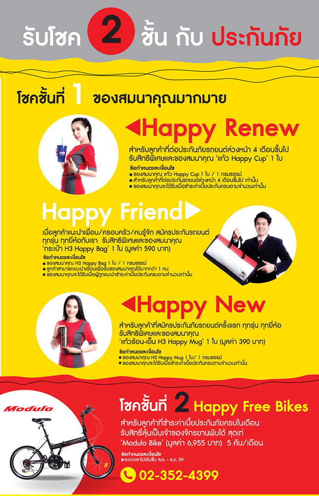 เมื่อแนะนำลูกค้าสมัครประกันภัยรถยนต์ทุกรุ่นทุกยี่ห้อ "Happy Friend" รับสิทธิพิเศษและรับ กระเป๋า "H3 Happy Bag" 1 ใบ (มูลค่า 590 บาท) และสำหรับลูกค้าที่สมัครประกันภัยครั้งแรกทุกรุ่นทุกยี่ห้อรับสิทธิพิเศษและรับ "แก้วร้อน-เย็น H3 Happy Mug" 1 ใบ (มูลค่า 390 บาท)