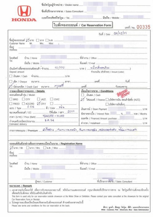 ในใบจอง ควรระบุข้อมูลที่ชัดเจนถึงวันรับรถ และของแถมที่ได้รับทั้งหมด (ระบุด้วยว่าเป็นของแท้ หรือเทียม) รวมถึงส่วนลดเงินสด ซึ่งถ้าขาดอะไรไป จะทำให้เซลล์แกล้งลืมของคุณได้ เซลล์หลายๆ คนจะไม่เขียนส่วนลดลงในใบจอง ก็ให้ระวังไว้ เพราะถ้าเซลล์บอกว่า ไม่ได้ให้ส่วนลด คุณจะเสียเปรียบ เพราะไม่มีอะไรยืนยันได้ ว่าคุณได้ส่วนลดกี่บาท ดังนั้นให้เซลล์เขียนรายละเอียดทั้งหมดลงไป เพื่อไม่ให้เสียประโยชน์ในอนาคต ที่สำคัญต้องระวังใบจอง ปลอมแปลงที่ไม่ใช่เป็นใบจองจากศูนย์โดยตรง และถึงเป็นจากศูนย์ก็เป็นใบจองเก่า ที่ไม่ได้รันเลขไว้แล้ว
