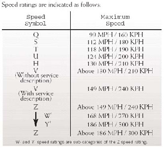 - H คือ ความเร็วสูงสุดที่ยางเส้นนั้นวิ่งได้ ต้องดูในรูปเปรียบเทียบด้านล่าง เดาไม่ได้ พบอักษร S T U H V Z R บ่อย มีหน่วยเป็นกิโลเมตร/ชั่วโมง (เช่น "H" ยางรองรับความเร็วได้สูงสุด 210 กม./ชม.) แต่ก็ไม่ควรใช้ความเร็วจนถึงตามที่ระบุไว้เพื่อความปลอดภัย