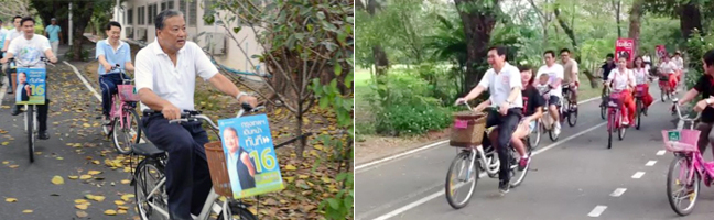 นับตั้งแต่ราคาน้ำมันที่พุ่งสูงขึ้นเรื่อยๆ ประกอบกับปัญหารถติด ทำให้คนกลุ่มหนึ่งที่เกิดความเบื่อหน่ายในสภาพการจราจรของกรุงเทพ หันมาใช้จักรยานในการเดินทาง ที่ช่วยทั้งประหยัดน้ำมัน และได้ออกกำลังกายไปในตัว ปีนี้จึงผู้สมัครหลายๆ คนที่ให้ความสนใจไปที่กลุ่มคนใช้จักรยาน อย่างที่เราได้เห็นกันตามสื่อที่ผู้สมัครบางคนมาขี่จักรยานหาเสียงกันด้วย