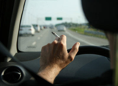การสูบบุหรี่ขณะขับรถนอกจากจะเป็นการทำร้ายปอดของคุณเองแล้ว ยังมีอัตรายกว่าคิดคุณคิด เพราะมือนึงจับพวงมาลัย-อีกมือคีบสุหรี่ส่งผลให้ความสามารถควบคุมรถนั้นลดลง (เทียบเท่าการถือโทรศัพท์และขับรถนั่นแหละ) เท่านั้นยังไม่พอต้องยื่นมือออกมานอกรถให้ควันออกสู่ด้านนอก เป็นอันตรายอาจถูกเฉี่ยวจากจักรยานยนต์หรือบาดเจ็บเมื่อเกิดอุบัติเหตุได้ และสิ่งสุดท้ายคุณๆ ที่สูบจนหนำใจแล้วก็ใช้ความมักง่ายทิ้งก้นบุหรี่ลงพื้น บางครั้งก็ใช้นิ้วดีดไกลๆ ให้พ้นรถตัวเอง จนบางทีรถที่ตามมาถูกก้นบุหรี่ของคุณกระเด็นใส่เต็มๆ เลิกเถอะครับอย่างน้อยก็ดับไฟและทิ้งในรถคุณเองดีกว่า เพื่อสังคมที่น่าอยู่