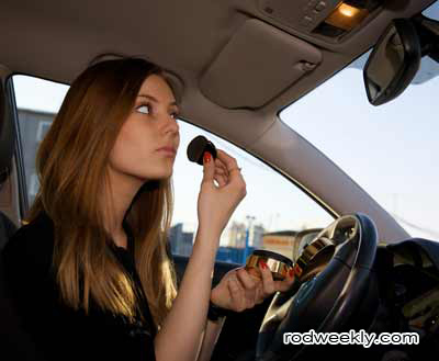 พฤติกรรมนี้พบเป็นประจำครับ แต่หากแต่งหน้าขณะรถจอดนิ่งติดสัญญาณไฟแดงก็ไม่น่าเป็นอะไร แต่หลายคนก็ขับไปแต่งหน้าพร้อมๆ กัน จนรถส่ายไปมา เสี่ยงการเกิดอุบัติเหตุมากพอๆ กับการหยิบของที่ตกบนพื้นรถเลยทีเดียว
