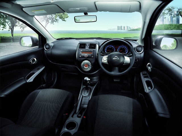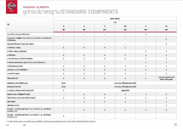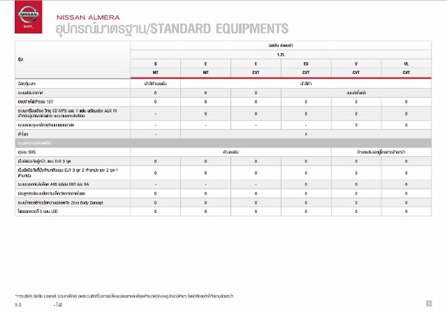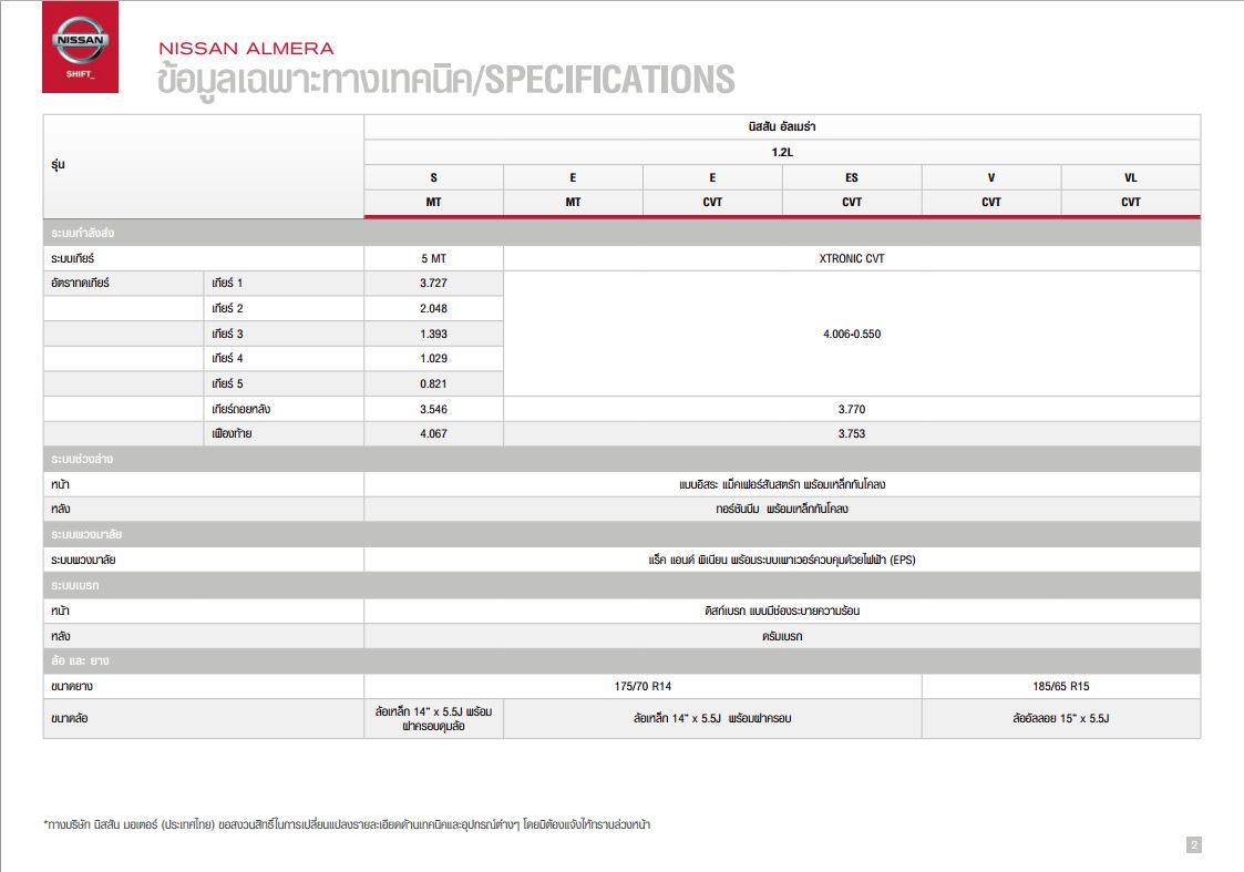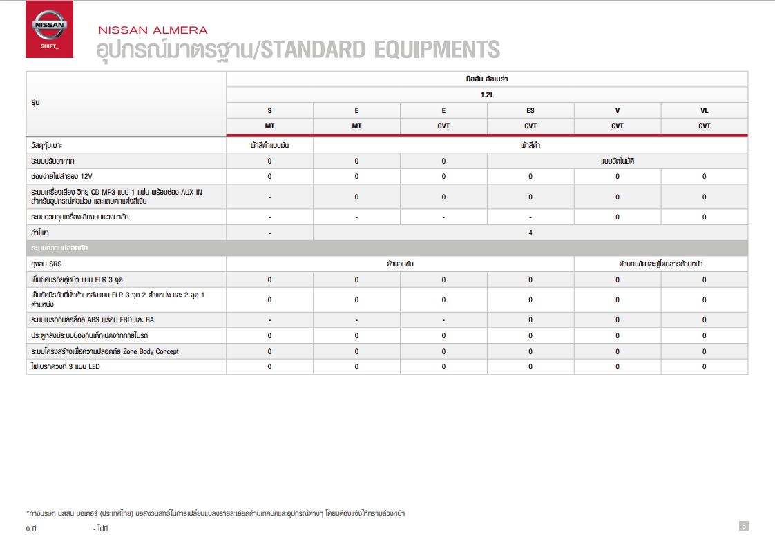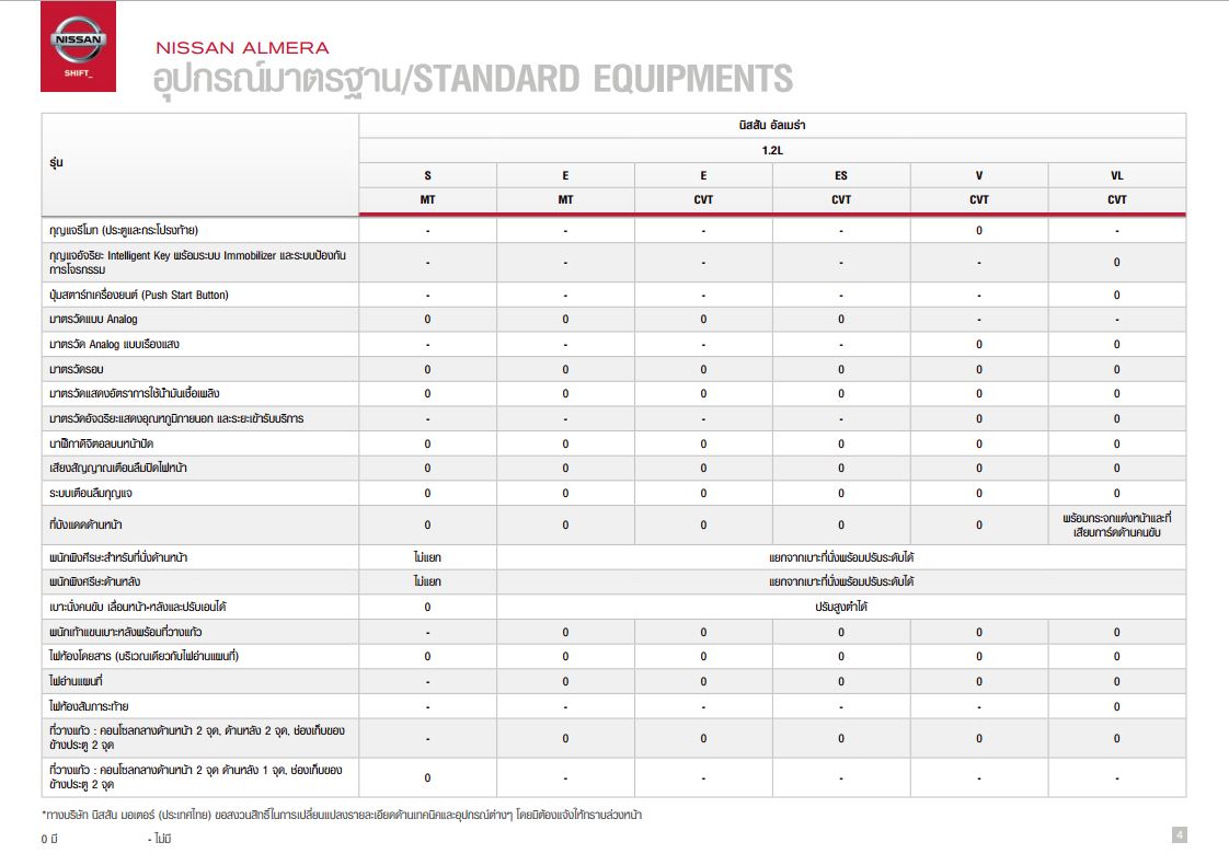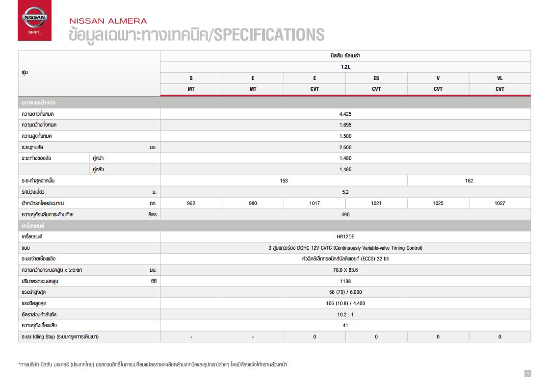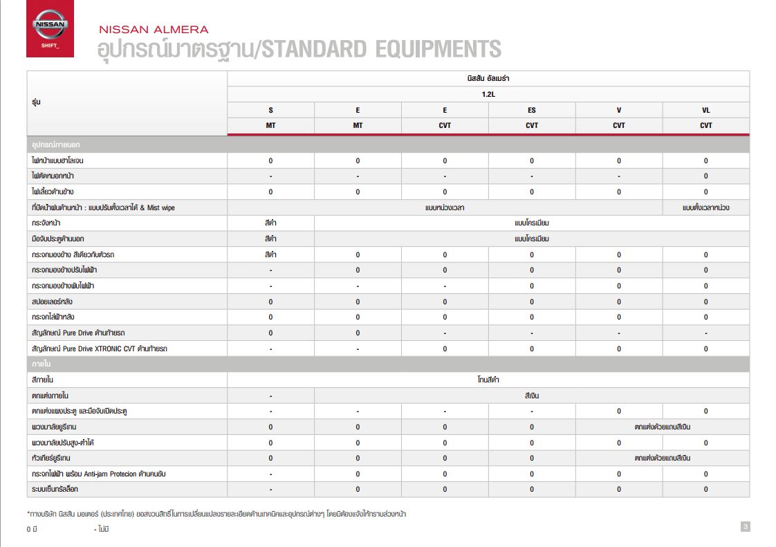 อัลเมร่า เป็นรุ่นที่ให้อุปกรณ์อำนวยความสะดวกค่อนข้างครบถ้วนที่สุด เมื่อเทียบรุ่นต่อรุ่น ทั้งปุ่มกดสตาร์ตเครื่องยนต์ รวมถึงระบบต่างๆ ขั้นพื้นฐานให้แบบไม่มีกั๊ก รูปทรงของอัลเมร่าที่ใหญ่กว้างขวางเทียบเคียงกับรถระดับบี-เซกเมนต์ (1,500 ซีซี) เหมือนใช้อีโค่คาร์ แต่ได้ความกว้างสะดวกสบายคล้ายรถขนาดกลาง อีกสิ่งที่สำคัญของอัลเมร่าที่เน้นเรื่องความประหยัดนอกจากอัตราสิ้นเปลืองน้ำมันแล้วยังติดตั้งระบบดับ-สตาร์ตเครื่องยนต์ในกรณีที่จอดนิ่งและเหยียบเบรก กับค้างเกียร์ตำแหน่ง "D" เกิน 3 วินาที เครื่องยนต์จะดับเอง โดยที่ระบบอื่นยังคงทำงาน (เว้นระบบปรับอากาศจะมีแต่ลมเป่าเท่านั้น) และเมื่อเราปล่อยเบรก หรือขยับพวงมาลัยนิดเดียว เครื่องยนต์จะติดเองทันที ทำให้มีอัตราสิ้นเปลืองน้ำมันเฉลี่ยที่มากกว่าคู่แข่งอีกนิดๆ ที่ 17-19 กม./ลิตร