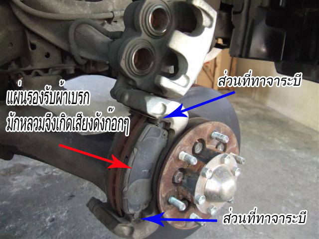 ควรทำความสะอาด และทาจาระบีที่แผ่นล็อกผ้าเบรก ระวัง! อย่าให้จาระบีถูกจานและผิวสัมผัสผ้าเบรก จานเบรกคดหรือบิดเบี้ยว สาเหตุนั้นเกิดได้หลายกรณี เช่น ขับด้วยความเร็วสูงๆ แล้วเบรกอย่างกะทันหัน, ขับต่อเนื่องนานๆ มีความร้อนสะสมที่จานเบรกแล้วขับผ่านแอ่งน้ำลึก จานถูกน้ำที่อุณหภูมิต่ำ ความร้อนจัดเจอกับเย็น จึงทำให้จานขยายตัวอย่างรวดเร็ว ผิดรูปร่างเดิม, การเกิดอุบัติเหตุ/แรงกระแทกจากการชน ฯลฯ ล้วนเป็นปัจจัยที่ทำให้จานเบรกคด หรือบิดตัวได้