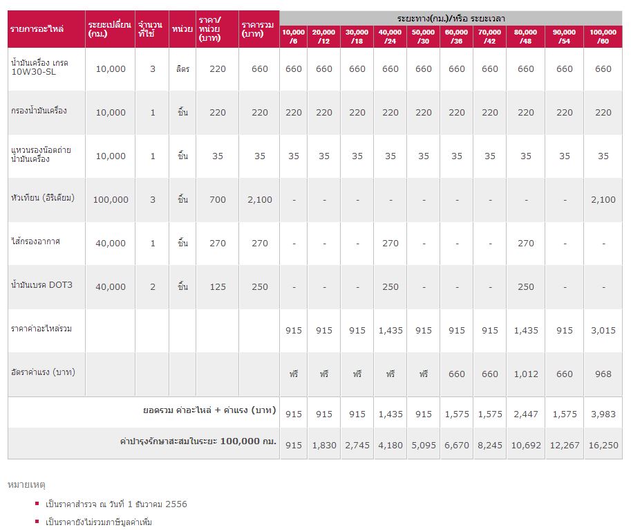 ตารางค่าใช้จ่ายบำรุงรักษา มิตซูบิชิ มิราจ