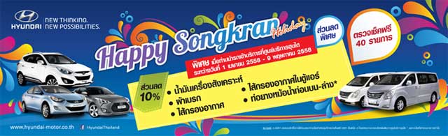 ฮุนได แฮปปี้ สงกรานต์ ตรวจเช็คฟรีถึง 40 รายการ พร้อมส่วนลด 10 % น้ำมันเครื่องสังเคราะห์ ผ้าเบรก ไส้กรองอากาศในตู้แอร์ ไส้กรองอากาศ และท่อยางหม้อน้ำท่อนบน-ล่าง* ตั้งแต่วันนี้ - 9 พ.ค. 58