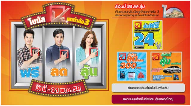 ร้อนนี้ ฟรี ลด ลุ้น กับแคมเปญโบนัสถูกใจยกกำลัง 3 เพียงพารถคู่ใจเข้าศูนย์บริการโตโยต้าทั่วประเทศ รับฟรี บริการตรวจเช็คสภาพรถ 24 รายการ พร้อมลุ้มส่วนลดอะไหล่ และลุ้นรถยนต์โตโยต้า วีออส ก่อน 31 พ.ค.58