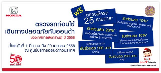 ฮอนด้า ตรวจรถก่อนใช้เดินทางปลอดภัยกับฮอนด้า โดยเปิดรับบริการตรวจเช็คฟรี 25 รายการ พร้อมรับส่วนลด 20 เปอร์เซ็นต์ เมื่อซื้อแพคเกจเช็คระยะฮอนด้าเพย์เซฟ (4 ระยะทาง), เปลี่ยนยางรถยนต์หรือแบตเตอรี่ รับส่วนลด 200 บาทต่อเส้นหรือลูก และรับส่วนลด 10 เปอร์เซ็นต์ เมื่อซื้อโปรแกรมฮอนด้าอัลติเมทแคร์ (อัลติเมท2,3) หรือผ้าเบรก/จานเบรก/แม่ปั๊มเบรก/หม้อลมเบรก/สายอ่อนเบรก* ก่อน 20 เม.ย. 58