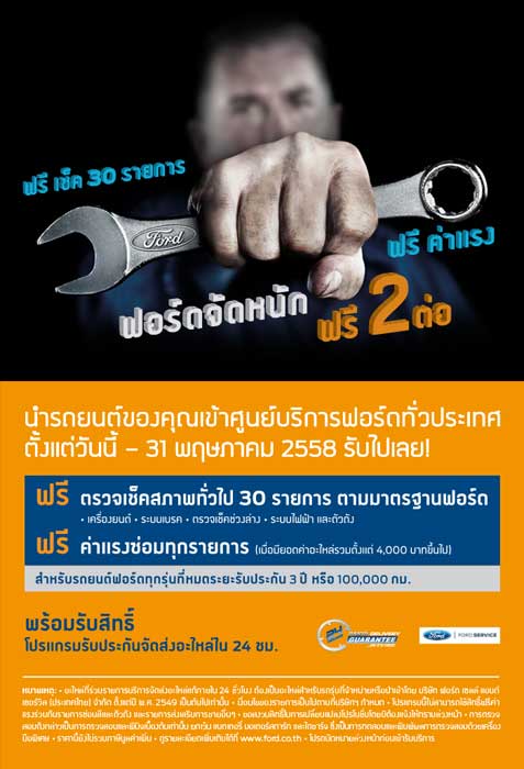 ฟอร์ด ให้เข้าตรวจเช็คฟรี 30 รายการ ตามมาตรฐานฟอร์ด ได้แก่ เครื่องยนต์ ระบบเบรก ตรวจเช็คช่วงล่าง ระบบไฟฟ้าและตัวถัง ฟรี ค่าแรงซ่อมทุกรายการ (เมื่อมียอดค่าอะไหล่รวมตั้งแต่ 4,000 บาทขึ้นไป) ตั้งแต่วันนี้ - 31 พ.ค. 58