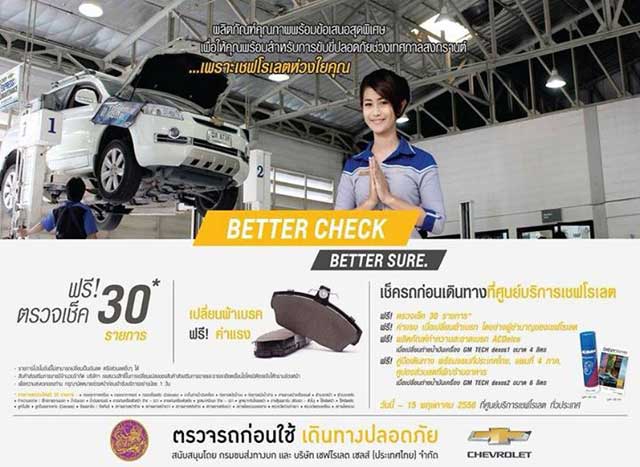 เชฟโรเลต ร่วมกับกรมขนส่งทางบกจัดแคมเปญ "ตรวจรถก่อนใช้ เดินทางปลอดภัย" เช็คฟรี 30 รายการ เปลี่ยนผ้าเบรค ฟรี ค่าแรง และฟรี...อีกหลายรายการ ตั้งแต่วันนี้ ถึง 15 พ.ค. 58 ที่ศูนย์บริการเชฟโรเลตทั่วประเทศ