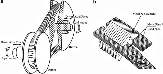 ภาพจาก f.ptcdn.info สายพานโลหะ = ทำหน้าที่ส่งแรงจากพูเล่ย์ขับไปยังพูเล่ย์ตาม โดยใช้ผิวสัมผัสด้านข้างหรือสันของสายพานเป็นจุดยึดจับกับร่องพูเล่ย์ที่มีความลาดชัน