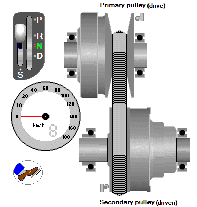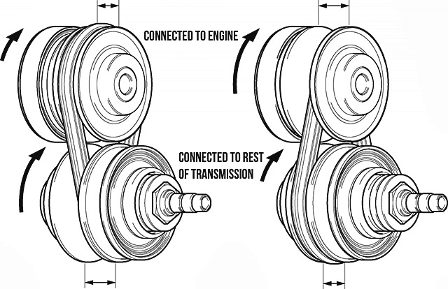 การทำงานของ CVT เริ่มจากการออกตัวหรือความเร็วต่ำ ร่องของ P1 จะอยู่ตำแหน่งกางออกมากที่สุด เพื่อให้สายพานหมุนในส่วนลาดชันที่เล็กที่สุด หรือเปรียบกับโซ่จักรยานก็คือ สเตอร์ขนาดเล็กสุดนั่นเอง ส่วนร่องของ P2 จะอยู่ตำแหน่งแคบสุดหรือหุบเข้ามากที่สุด เพื่อให้มีอัตราทดสูงๆ ในการออกตัวนั่นเองครับ