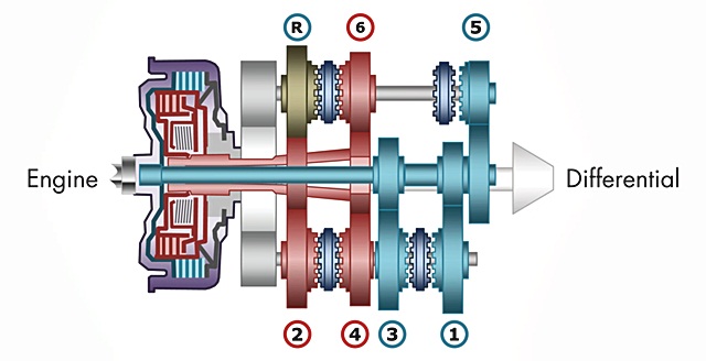 Dual Clutch คือ ระบบคลัตช์แห้งแบบแผ่นหรือชุดตัดต่อกำลังจากฟลายวิลไปยังชุดเกียร์ ซึ่งใช้ชุดคลัตช์ 2 ชุดทำงานสลับกัน โดยแต่ละชุดคลัตช์นั้นจะช่วยเข้าตำแหน่งเกียร์ 1,3,5 และชุดคลัตช์ที่ 2 จะคอยเข้าเกียร์ 2,4,6 ทำให้การตัดต่อกำลังและการเปลี่ยนเกียร์รวดเร็วทันใจ โดยมีกลไกไฟฟ้าหรือระบบไฮดรอลิกช่วยทำหน้าที่ในการกดคลัตช์แทนขาของผู้ขับนั่นเองครับ (ในรถบางรุ่นอาจสลับตำแหน่งเกียร์แตกต่างกัน)