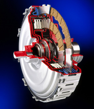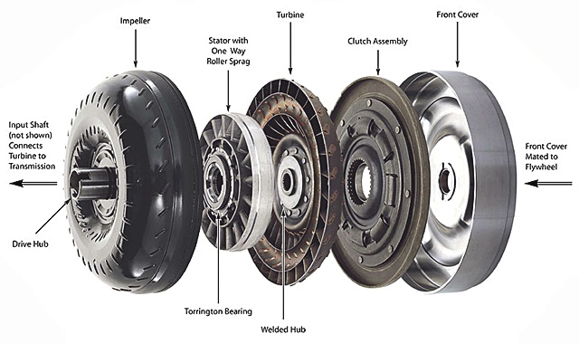 Torque Converter คือ ชุดตัดต่อกำลังมีลักษณะคล้ายล้อกลมๆ ภายในมีชุดกังหันหรือใบพัด 2 ชุด และแผ่นรีดบังคับน้ำมันประกบอยู่ ทำงานโดยการใช้น้ำมันเกียร์ (สีแดงๆ นี่แหละ) เป็นตัวส่งผ่านกำลังจากใบพัดชุดที่รับกำลังมาจากฟลายวิล (ล้อช่วยแรง) ไป "ปั่น" ใบพัดอีกฝั่งที่ติดกับชุดเกียร์ให้หมุนตาม นึกถึงการเอาพัดลม 2 ตัวหันหน้าชนกันและเปิดเพียง 1 ตัว ตัวที่ไม่เปิดใบพัดจะหมุนตามแรงลม โดยที่ "ลม" ก็เปรียบเสมือนกับน้ำมันเกียร์ที่อยู่ภายในระบบทอร์คคอนเวอร์เตอร์นั่นเอง