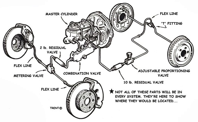ระบบเบรกเป็นส่วนประกอบที่สำคัญของรถยนต์ ทำหน้าที่ห้ามล้อ ชะลอหรือลดความเร็ว โดยมีส่วนประกอบคือ หม้อลมเบรก กระบอกลูกสูบเบรกด้านบน (ส่วนที่ต่อกับแป้นเบรกในรถ), ท่อทางเดินระบบเบรกไปยังชิ้นส่วนต่างๆ, วาล์วควบคุมแรงดันและกระจายแรงเบรก, อุปกรณ์ระบบปั๊ม ABS (ถ้ามี), แม่ปั๊มเบรกล่างหรือคาลิปเปอร์ (ดิสก์เบรก) / ลูกสูบเบรก (ดรัมเบรก), และน้ำมันเบรก เป็นต้น