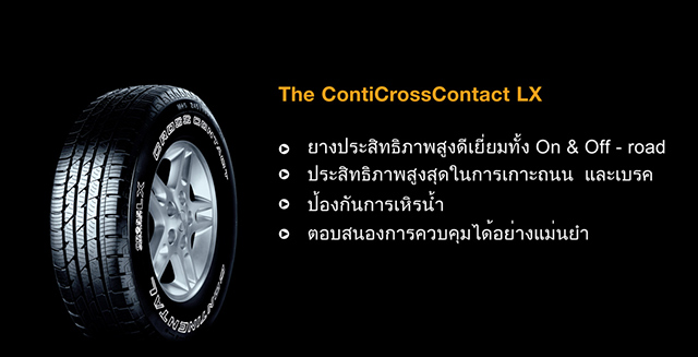 - ContiCrossContact LX2 มีให้เลือกหลายขนาดตามความต้องการในการใช้งาน ยางรุ่นนี้นอกจากจะปลอดภัย เกาะถนนดีแล้ว ยังขับได้นุ่มนวลและเงียบ ให้การเดินทางอย่างราบรื่นได้มากกว่า นอกจากนี้ยังมีความทนทาน วิ่งได้มากถึง 100,000 กิโลเมตร เหมาะสำหรับการขับขี่บน