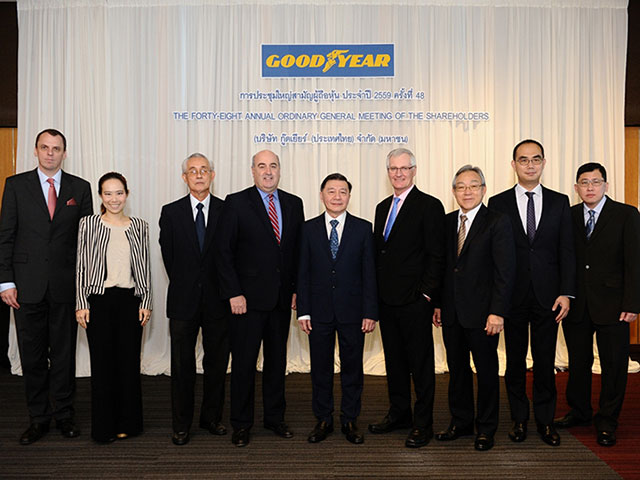บริษัท กู๊ดเยียร์ (ประเทศไทย) จำกัด (มหาชน) จัดประชุมใหญ่สามัญประจำปีของผู้ถือหุ้น ครั้งที่ 48 โดย มร.ฟินบาร์ โอคอนเนอร์ กรรมการผู้จัดการ ได้แถลงผลการดำเนินงานที่โดดเด่นของกู๊ดเยียร์ ประเทศไทยในปี 2558 และได้แสดงความเชื่อมั่นต่อธุรกิจของบริษัททั้งในประเทศและเพื่อการส่งออกสำหรับปี 2559 นี้ สะท้อนให้เห็นถึงความมุ่งมั่นและความพยายามของบริษัท ทั้งในส่วนของความผูกพันของพนักงานต่อองค์กร การพัฒนาและฝึกอบรม เครือข่ายการจัดจำหน่ายในประเทศที่ขยายตัว และจำนวนสายผลิตภัณฑ์ รวมทั้งการได้ลูกค้าเพิ่มขึ้นในธุรกิจยางสำหรับเครื่องบิน