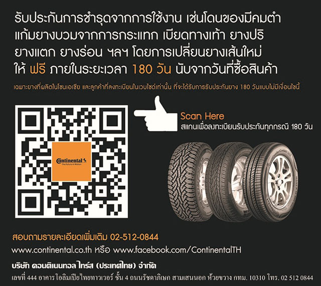 www.continental-th.com หรือที่ร้านค้า เพื่อรับสิทธิรับประกันยางทุกกรณี 180 วันหลังจากซื้อ โดยบริษัทฯ จะเปลี่ยนยางใหม่ให้ทันที ไม่ว่าจะถูกของมีคมตำ แก้มยางบวมจากการกระแทก เบียดทางเท้า ยางปริ ยางแตก ยางร่อน โปรโมชั่นนี้ใช้ได้สำหรับยางที่ผลิตในโซนเอเชียเท่านั้น