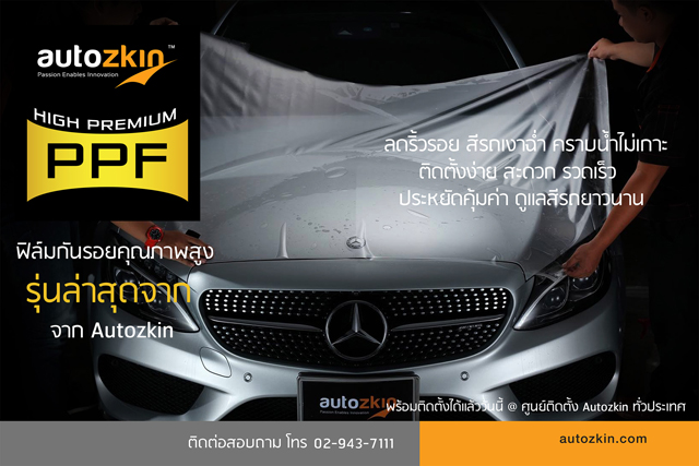 บริษัท ออโต้ซคิน จำกัด ผู้นำเข้าและจัดจำหน่ายฟิล์มกันรอยปกป้องสีรถ Autozkin พร้อมศูนย์ติดตั้งมาตรฐานเจ้าแรกในประเทศไทย เปิดตัวนวัตกรรม PPF รุ่นล่าสุด Autozkin High-Premium PPF นวัตกรรมฟิล์มกันรอยที่มีคุณภาพสูง ทำการผลิตและพัฒนาร่วมกับบริษัทชั้นนำของญี่ปุ่นที่ได้มาตรฐานสูง ผ่านการทดสอบเนื้อฟิล์มทั้งในห้องแล็ปและทดลองติดตั้งจริงบนตัวถังรถยนต์ก่อนออกจำหน่ายมากว่า 3 ปีมุ่งเน้นทำตลาดในกลุ่มรถหรูและรถระดับพรีเมี่ยมทุกรุ่นทุกยี่ห้อ เพื่อขยายฐานลูกค้าให้มีกำลังในการติดตั้งฟิล์มกันรอยได้มากขึ้น โดยตั้งราคาค่าติดตั้งสีรถทั้งคันไม่เกินแสนบาท ทำให้การติดตั้งฟิล์มกันรอยมีราคาใกล้เคียงกับการทำเคลือบแก้ว โดยบริษัทฯ ตั้งเป้าการขายถึงสิ้นปี 800 คัน