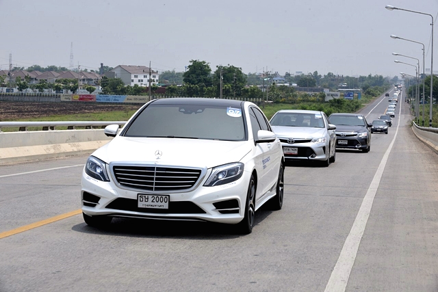 ขบวนคาราวานทดสอบยางรถยนต์ “TURANZA T005A” เริ่มกันที่โรงแรม ดิ แอทธินี แบงค็อก โดยติดตั้งในรถซีดานหรูคละยี่ห้อและรุ่น 12 คัน ผู้เขียนจับฉลากได้โตโยต้า คัมรี 2.0 ใหม่ ที่ใช้สเปคยาง 205/60R16 โดยใช้ความเร็ว 90-120 กม./ชม. เป็นส่วนใหญ่เสมือนการเดินทางจริง พร้อมสังเกตการตอบสนองและเสียงจากการขับผ่านสภาพถนนที่แตกต่างกัน ด้วยคุณสมบัติเด่นของ “TURANZA T005A” ที่ใช้จำนวนและรูปลักษณ์ของบล็อกดอกยางที่ไม่เท่ากัน บวกกับร่องดอกยางที่ถูกปรับให้อยู่ในมุมที่เหมาะสม ทำให้เวลาสัมผัสกับพื้นผิวถนนจึงช่วยลดแรงกระแทกและลดเสียงรบกวนขณะขับ รวมทั้งยังให้ความนุ่มสบายยิ่งขึ้น ด้วยรูปทรงที่กระจายแรงกดที่กระทำต่อหน้ายางอย่างสม่ำเสมอ พร้อมเสริมเนื้อยางพิเศษบริเวณแก้มยาง จึงช่วยลดแรงสั่นสะเทือนจากพื้นผิวและรอยต่อของถนนได้ดีอย่างน่าพอใจ ผู้เขียนได้ลองขับเข้าโค้งซ้ายทางลงด้วยความเร็วประมาณ 60 กม./ชม. ยางก็ตอบสนองการยึดเกาะได้อย่างดีเยี่ยมสามารถเกาะไลน์ในไปตลอดโค้งโดยไม่แสดงอาการหรือเสียงใดๆ ให้ความรู้สึกมั่นใจจริงๆ ส่วนหนึ่งเป็นเพราะบริดจสโตนได้ใช้เทคโนโลยีการผสมเนื้อยางแบบใหม่ Nano Pro-Tech™ เอกสิทธิ์เฉพาะของบริดจสโตน ที่ผสมโพลิเมอร์เข้ากับซิลิก้าคุณภาพสูง จึงทำให้การยึดเกาะพื้นถนนมีประสิทธิภาพมากขึ้น พร้อมปรับลายดอกยางให้โค้งมน จึงช่วยลดการบิดตัวของร่องดอกยาง เพิ่มประสิทธิภาพในการขับและการเบรก