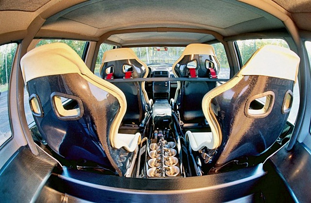 ภายในไม่เหลือความสะดวกสบายทิ้งไว้ แต่ทำโครงเหล็กหรือโรลบาร์ขึ้นใหม่ พร้อมเบาะอีก 4 ที่นั่ง ให้พาผู้โดยสารเพลิดเพลินไปกับอัตราเร่งสุดโหดของเครื่องยนต์จากตัวแข่ง F1