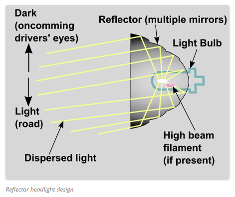 ไฟหน้ารถยนต์ถูกออกแบบมาให้ใช้ระบบหลอดไฟส่องสว่างที่เฉพาะรุ่น เช่น โคมไฟมัลติรีเฟล็กเตอร์ที่ใช้ "ฮาโลเจน" ก็จะถูกออกแบบจานสะท้อนแสงให้รวบรวมและกระจายแสงให้ทิศทางที่ถูกต้องเป็นเส้นแนวเดียวกัน เพื่อส่องพื้นถนนและบริเวณด้านข้างให้สามารถมองเห็น โดยไม่เป็นอันตรายต่อรถยนต์ที่วิ่งสวนทางมาหรือรถที่ขับนำหน้าอยู่