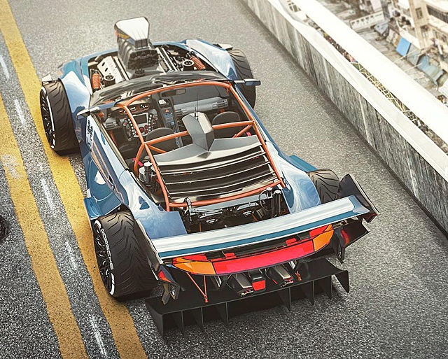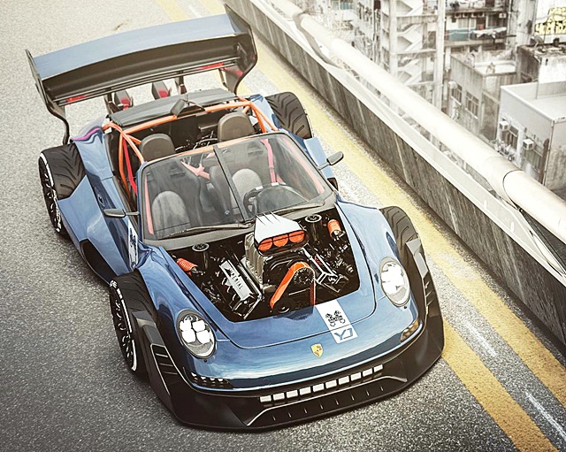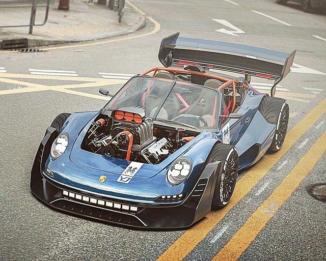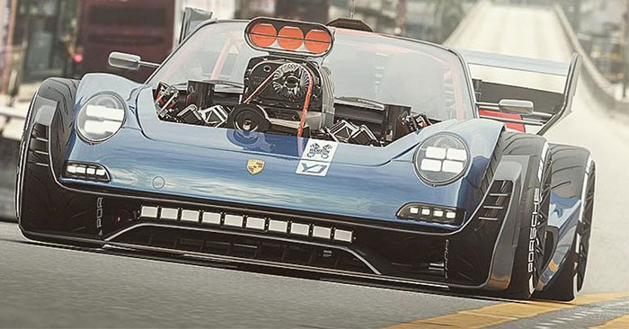 ปอร์เช่คันนี้ถูก "หั่น" ตัวถังด้านหลังออกจนกุด จากนั้นก็สร้างจุดยึดวางเครื่องยนต์บล็อคใหญ่อย่างวี 8 สูบ ซูเปอร์ชาร์จ จาก ปรับเปลี่ยนไฟหน้า HEMI