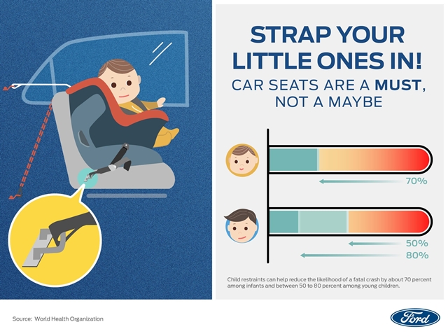 รถฟอร์ดหลายรุ่น มาพร้อมขอเกี่ยวสำหรับเบาะนั่งนิรภัยสำหรับเด็กตามมาตรฐาน (Lower Anchors and Tethers for Children หรือ LATCH)[5] ที่รองรับเบาะนั่งนิรภัยสำหรับเด็กได้หลายรูปแบบ แต่คุณพ่อคุณแม่ก็ควรตรวจสอบอีกครั้งว่า ติดตั้งเบาะนั่งนิรภัยสำหรับเด็กด้วยการยึดกับตัวล็อคด้านล่างและด้านบนอย่างถูกต้อง อีกทั้งยังควรคำนึงด้วยว่า เบาะนั่งนิรภัยนี้ควรสามารถนำไปใช้กับรถคันอื่นๆ ได้ด้วย