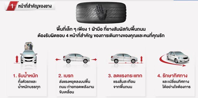 ยางรถยนต์มีพื้นที่สัมผัสกับผิวถนนจริงๆ เพียงประมาณ 1 ฝ่ามือเท่านั้น หมายถึงรถยนต์คันนั้นมีเพียง 4 ฝ่ามือ (4 ล้อ) ในการที่จะเคลื่อนที่ไปจากจุดหนึ่งไปอีกจุดหนึ่ง ดังนั้นหน้าที่ของยาง ได้แก่