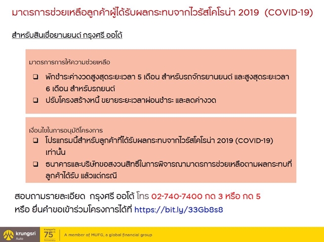 ลูกค้าสินเชื่อกรุงศรีออโต้ เช่าซื้อรถยนต์ พักชำระค่างวดสูงสุดระยะเวลา 5 เดือน สำหรับรถจักรยานยนต์ และสูงสุดระยะเวลา 6 เดือน สำหรับรถยนต์ ปรับลดจำนวนเงินผ่อนชำระค่างวด(แล้วแต่กรณี) หรือปรับโครงสร้างหนี้ ขยายเวลาผ่อนชำระและลดค่างวด