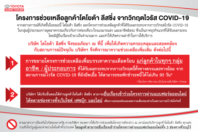 Toyota Leasing โตโยต้ามีมาตรการช่วยเหลือลูกค้าคือ สามารถขอพักชำระหนี้ได้ไม่เกิน 90 วัน ประมาณ 3 เดือน และสามารถยื่นเรื่องเข้าร่วมโครงการผ่านแบบฟอร์มออนไลน์ได้หลายช่องทางทั้งเว็บไซต์ เฟซบุ๊ก และไลน์ ของโตโยต้า ลีสซิ่ง เพื่อความปลอดภัยและลดความเสี่ยงของท่านในสถานการณ์ไวรัสโควิดนี้