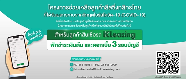 สอบถามข้อมูลเพิ่มเติม KLeasing Call Center 02-6969999 กด 60 (จันทร์-ศุกร์ 8.30-20.00 น. และ วันเสาร์-อาทิตย์ วันหยุดนักขัตฤกษ์ 8.30 น. -17.00 น.) อีเมล: klcontactcenter@kasikornleasing.com