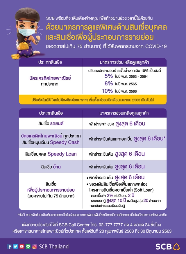 เงื่อนไขในการอนุมัติโครงการ โปรแกรมนี้สำหรับลูกค้าที่ได้รับผลกระทบจากไวรัสโคโรน่า 2019 (COVID-19) เท่านั้น ธนาคารขอสงวนสิทธิ์ในการพิจารณามาตรการช่วยเหลือตามผลกระทบที่ลูกค้าได้รับ แล้วแต่กรณี