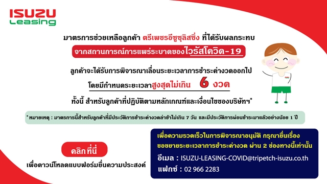 Isuzu Leasing เลื่อนการชำระหนีไม่เกิน 6 เดือน สำหรับผู้ที่ปฏิบัติตามหลักเกณฑ์และเงื่อนไขบริษัทฯ และมาตรการนี้สำหรับลูกค้าที่มีประวัติการชำระค่างวดล่าช้าไม่เกิน 7 วัน และต้องชำระมาแล้วอย่างน้อย 1 ปี
