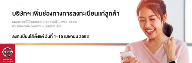 คลิกเพื่อกรอกรายละเอียด Nissan Leasing พักชำระหนี้สูงสุด 3 เดือน บริษัทฯ เพิ่มช่องทางการลงทะเบียนแก่ลูกค้าเฉพาะรายที่ได้รับผลกระทบจากกรณี COVID-19 และประสงค์ขอเลื่อนพักชำระหนี้สูงสุด 3 เดือน ต้องเป็นผู้เช่าซื้อตามสัญญา ผ่อนชำระค่างวดมาแล้ว 12 เดือน เป็นลูกค้าที่มีประวัติการผ่อนชำระดีตามเงื่อนไขของบริษัทฯ ลงทะเบียนได้ตั้งแต่ วันที่ 1-15 เมษายน 2563