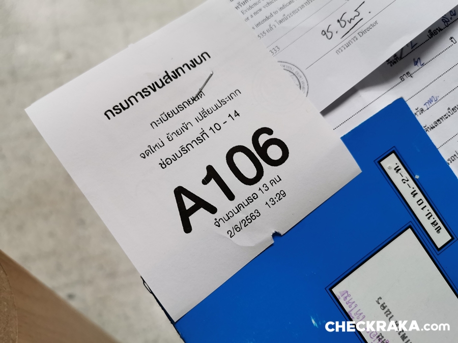 - นำสมุดคู่มือรถยนต์พร้อมถอดป้ายทะเบียนเดิม นำไปยื่นเรื่องที่ประชาสัมพันธ์เจ้าหน้าที่จะให้คำแนะนำพร้อมรับบัตรคิว