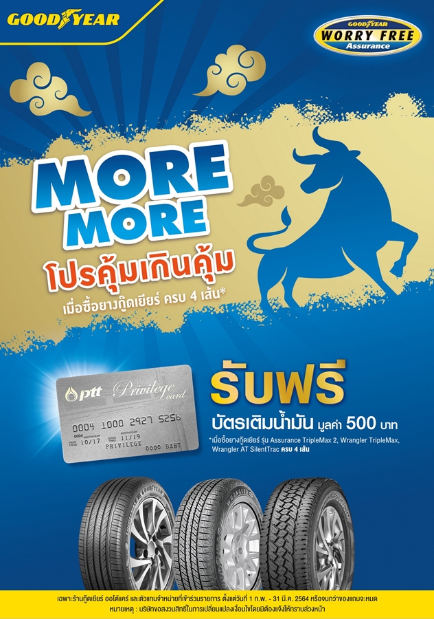 กู๊ดเยียร์ ประเทศไทย จัด 2 โปรโมชั่น ต้อนรับปีวัวสุดปัง กับ More More โปรคุ้มเกินคุ้ม มอบสิทธิพิเศษให้กับลูกค้า เมื่อซื้อยางกู๊ดเยียร์รุ่น แอชชัวแรนซ์ ทริปเปิ้ลแมกซ์ 2, แรงเลอร์ ทริปเปิ้ลแมกซ์ และ แรงเลอร์ เอที ไซเลนแทรค ครบ 4 เส้น รับฟรีทันที บัตรเติมน้ำมัน มูลค่า 500 บาท