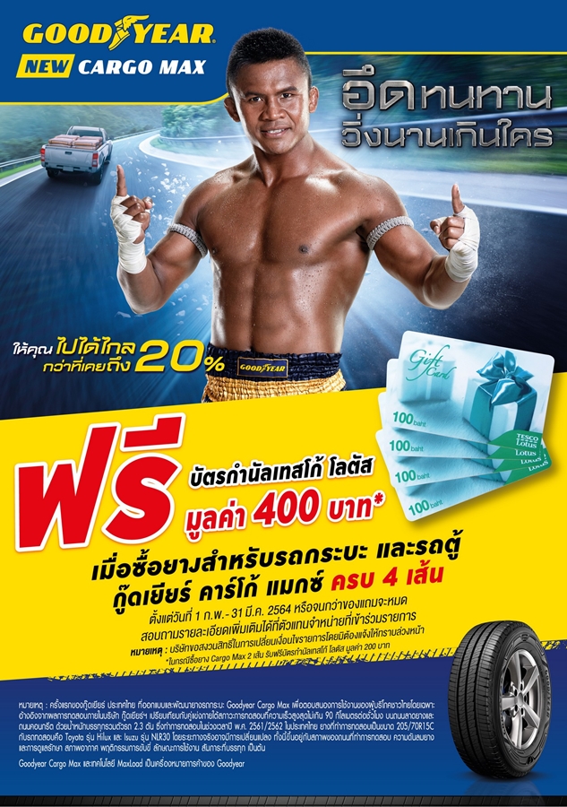 และโปรสำหรับลูกค้าที่ซื้อยางกู๊ดเยียร์รุ่น คาร์โก้ แมกซ์ ยางพรีเมี่ยมสำหรับรถกระบะและรถตู้ ครบ 4 เส้น รับทันทีบัตรกำนัลเทสโก้ โลตัส มูลค่า 400 บาท
