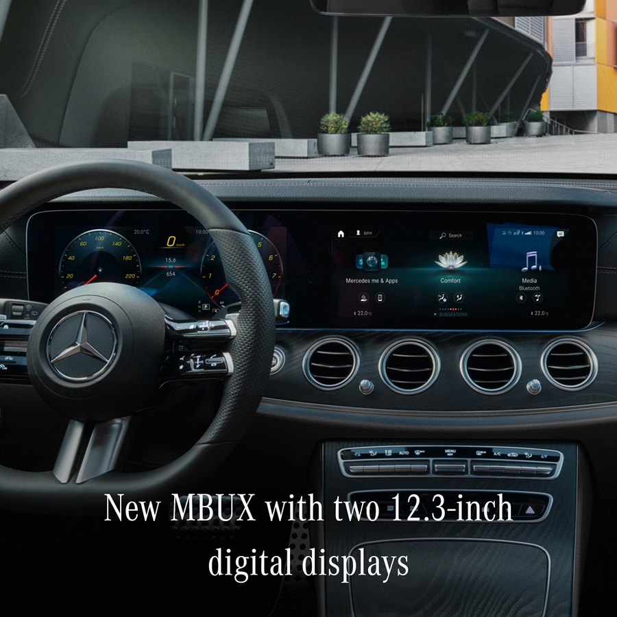 ระบบการใช้งานภายในของ E 300 e AMG Dynamic ผสานทุกการควบคุมเข้าไว้ด้วยกัน ด้วยระบบปฏิบัติการแบบ MBUX (Mercedes-Benz User Experience) รุ่นล่าสุดแสดงผลด้วยหน้าจอขนาดใหญ่แบบ Digital Widescreen cockpit ขนาด 12.3 นิ้ว จำนวน 2 หน้าจอ ซึ่งหน้าจอแบบนี้รวมถึงฟังก์ชั่นการทำงานต่างๆ ติดตั้งเป็นอุปกรณ์มาตรฐานสำหรับ E-Class ทุกรุ่น ควบคุมด้วยระบบสัมผัสหน้าจอ, แป้นควบคุมแบบ Touchpad และระบบสั่งการด้วยเสียงรูปแบบใหม่ที่ใช้การวิเคราะห์ด้วยระบบ AI ง่ายดายและปลอดภัยด้วยการเริ่มการใช้งานเพียงแค่พูดว่า "Hey Mercedes" ผสานรถยนต์และโทรศัพท์มือถือ Smart phone ให้เข้ากันได้อย่างลงตัวด้วยระบบเชื่อมต่อแบบ Smart Phone integration ที่ใช้งานได้ทั้ง Apple CarPlay และ Android Auto ระบบแผนที่นำทางแบบ 3 มิติ
