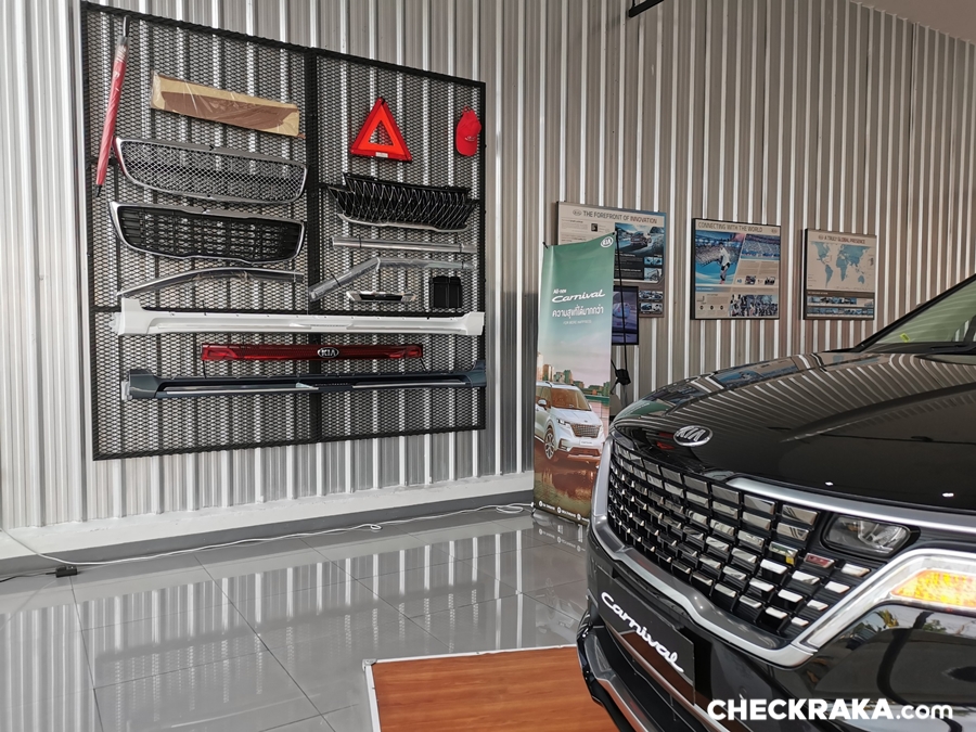 เมื่อเข้ามาภายในโชว์รูมก็จะพบกับ KIA Carnival รถครอบครัวยอดนิยม จอดโชว์ตัวให้ลูกค้าได้ชมกัน นอกจากนี้ยังแบ่งเป็นส่วนแสดงอุปกรณ์ตกแต่งสำหรับรถ Carnival แท้ที่นำเข้าจากประเทศเกาหลีตรงรุ่นพร้อมบริการติดตั้ง ซึ่งประกอบด้วยชุดแต่งรุ่นล่าสุด Black Panther ตรงรุ่นไม่ต้องดัดแปลงนำเข้าจากเกาหลีทั้งชุด โดดเด่นด้วยสีดำเพิ่งความดุดันและสปอร์ตมากขึ้น