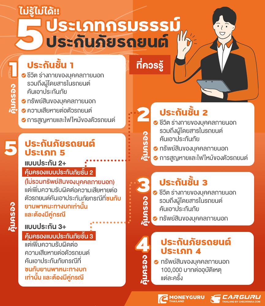 ทำความเข้าใจกับ "ประกันภัยรถยนต์" และประเภทประกันภัยที่ควรรู้ "ประกันภัยรถยนต์ (Motor Insurance)" นับเป็นประกันวินาศภัยประเภทหนึ่ง ที่ให้ความคุ้มครองแก่ผู้เอาประกันเมื่อเกิดความสูญเสียหรือความเสียหายอันเกิดจากการใช้รถยนต์ ซึ่งประเภทประกันภัยที่เราควรรู้นั้นจะแบ่งเป็น 2 ประเภท คือ 1) ประกันภัยรถยนต์ภาคบังคับ (Compulsory Motor Insurance) ที่ทุกคนเรียกว่า "ประกันภัย พ.ร.บ." นั่นเอง และประเภทที่ 2) ประกันภัยรถยนต์ภาคสมัครใจ (Voluntary Motor Insurance) โดยประกันภัยประเภทนี้เราจะต้องเลือกซื้อความคุ้มครองตามความต้องการของเราเองไม่มีใครบังคับ ซึ่งประกันภัยรถยนต์ภาคสมัครใจนี้จะเป็นการรับผิดชอบต่อความเสียหายส่วนที่เกินจากความรับผิดชอบของประกันภัยรถยนต์ภาคบังคับนั่นเอง เมื่อได้ทำความเข้าใจกับ "ประกันภัยรถยนต์" กันแล้ว เรามาดูกันต่อค่ะว่า ในส่วนของประกันภัยรถยนต์ภาคสมัครใจที่เราต้องเป็นคนเลือกเองนี้ มีกรมธรรม์แบบไหนบ้าง? และแต่ละกรมธรรม์แตกต่างกันอย่างไร? มาดูไปพร้อมกันเลยค่ะ