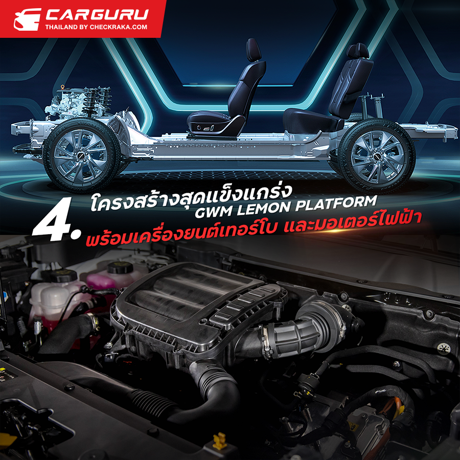 4. โครงสร้างตัวถังสุดแข็งแกร่ง GWM LEMON PLATFORM พร้อมเครื่องยนต์เบนซินเทอร์โบ และมีมอเตอร์ไฟฟ้า ให้พละกำลังถึง 243 แรงม้า