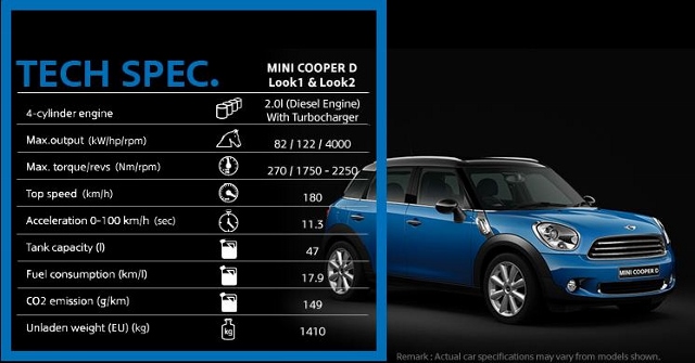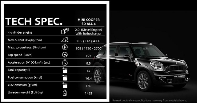 ความเร็วสูงสุดโดยประมาณ 180 กม./ชม. อัตราเร่ง 0-100 กม./ชม. 11.3 วินาที อัตราสิ้นเปลืองน้ำมันโดยเฉลี่ย 17.9 กม./ลิตร MINI Cooper SD ALL4 Countryman