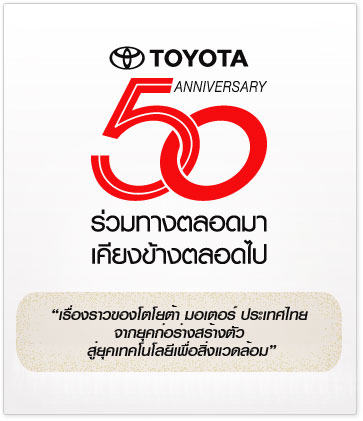 บริษัท โตโยต้า มอเตอร์ ประเทศไทย จำกัด ได้เข้ามาดำเนินธุรกิจในประเทศไทย ตั้งแต่ปี พ.ศ. 2505 ตลอดระยะเวลากว่า 50 ปี ของการดำเนินธุรกิจในประเทศ โตโยต้าได้มีการพัฒนาและขยายตัวทางธุรกิจอย่างต่อเนื่อง จากการมีโรงงานประกอบรถยนต์เพื่อจำหน่ายในประเทศ ไปสู่การผลิตเพื่อส่งออกไปยังประเทศต่างๆ ทั่วโลกกว่า 119 ประเทศ พร้อมพัฒนาไปสู่การเป็นฐานการผลิตที่สำคัญของโตโยต้าในภูมิภาคนี้ ส่งผลให้เกิดการจ้างงานควบคู่กับการมีส่วนร่วมในการส่งเสริมเศรษฐกิจโดยรวมของประเทศ